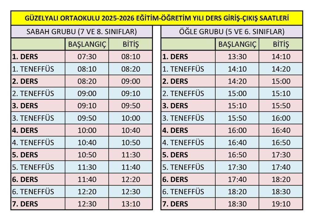2025-2026 Eğitim-Öğretim Yılı Ders Giriş Çıkış Saatleri